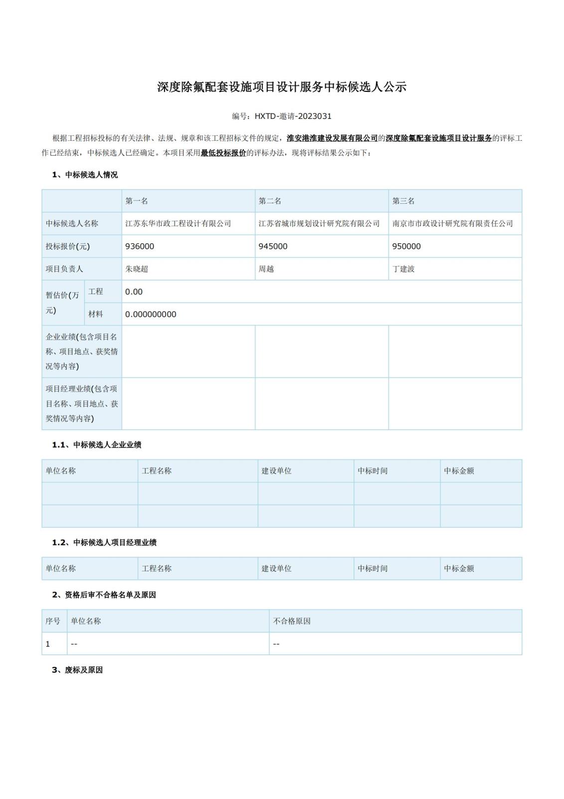 深度除氟配套設施項目設計服務中標候選人公示